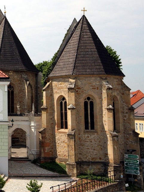 Die Martinikapelle (ehemaliger Karner) befindet sich rechts vom Eingang in den ehemaligen Friedhof, der rund um die Kirche angelegt war. Diese Kapelle ist ein gotischer Bau aus der Zeit um 1400 und hat an der Westseite ein sehenswertes, gotisches Giebeltürmchen. Im Raum unter der Kapelle sind die Gebeine aus dem aufgelassenen Friedhof aufbewahrt. Wochentags werden in der Kapelle hl. Messen gefeiert. |