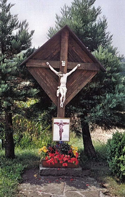Das südlich der B 44 stehende Holzkreuz ist stets sehr gut gepflegt. Am unteren Teil des Kreuzes ist ein Bild mit dem gekreuzigten Christus angebracht. Auch bei diesem handelt es sich um ein typisches Weg- oder Dorfkreuz. |