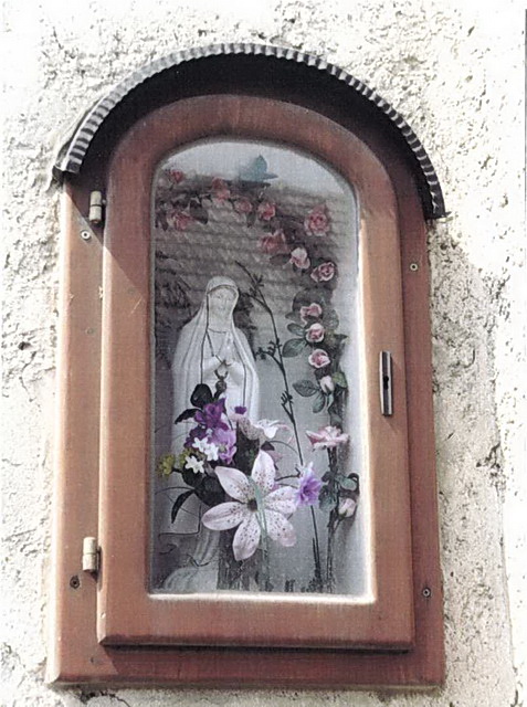 Die Mauernische ist etwa 70 mal 40 cm groß und enthält eine sehr schöne Marienstatue. Die Nische wurde bei der Hausrenovierung in den Nachkriegsjahren erneuert und mit einem Holzrahmen und Rundbogenfenster mit Kupferblechabdeckung versehen. Um die Marienstatue ist immer Blumenschmuck vorhanden. |
