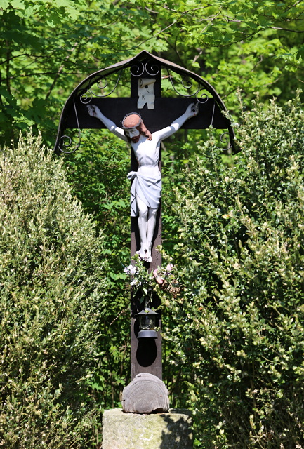 Das typische Wegkreuz wird von den Schwestern des Klosters Stein gut gepflegt. Zu beiden Seiten steht eine größere Zierpflanze. Es ladet die Wanderer zur kurzen Rast ein.