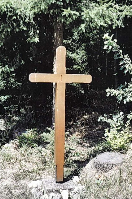 Entlang der Zufahrt zum Friedhof des Klosters Stein, stehen vom Hauptkreuz bis zum Friedhof vierzehn schlichte Holzkreuze mit den eingestanzten Nummern I - XIV, die einen Kreuzweg darstellen. Auf dem obigen Foto ist das I. Kreuz abgebildet. |