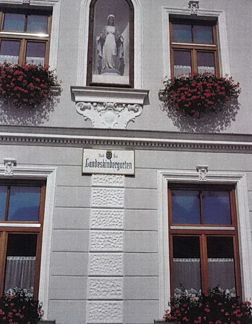 Maria Anzbach, Landeskindergarten an der Südseite zwischen den Fenstern des Obergeschoßes (Marktplatz)
