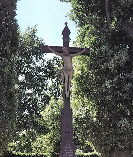 Das ca. 7 bis 8 m hohe aus Metall hergestellte Friedhofskreuz wurde 1896 beim Neubau des Gemeinde-Friedhofes errichtet. Das große und künstlerisch sehr schön gestaltete Kreuz wurde 1996 von der Schlosserei Heinrich Stransky, Unter Oberndorf, Feldgasse 156, renoviert.